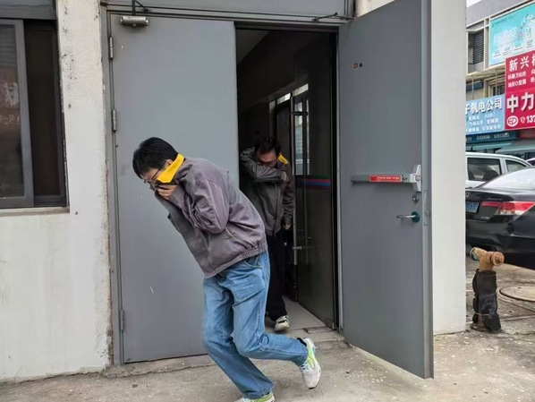 随着一阵急促的消防警报声响起,演练正式拉开帷幕。各部门的疏散组织者迅速就位,沉着指挥,全体办公人员在疏散组织者的引导下,立即做出反应,用湿毛巾和衣物捂住口鼻,弯腰低姿,沿着办公楼预设的疏散路线快速向北侧安全集结区撤离。整个疏散过程中,大家行动有序、配合默契,既保持了紧张的应急状态,又无拥挤、慌乱现象。最终,仅用时3分钟,所有参与人员全部安全抵达指定集合地点,疏散任务高效完成,达到了预期演练目标。